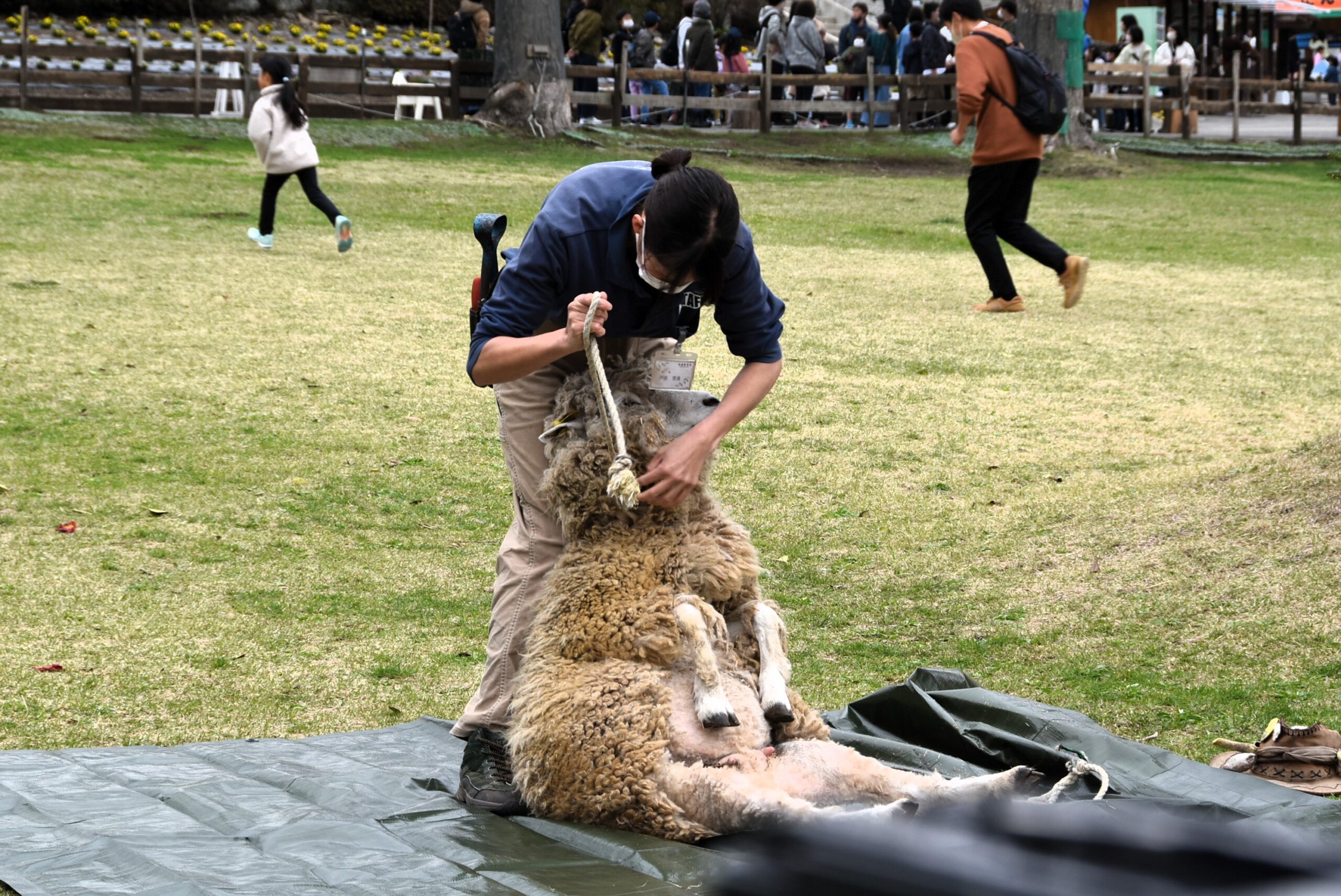 夏に向けて羊たちも衣替え。もこもこの毛を大きなはさみで刈っていきます。
