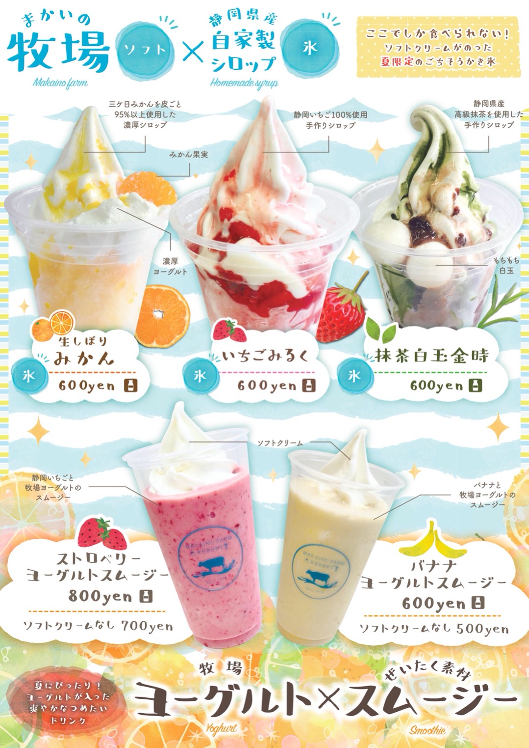 県内産の素材にこだわった「ごちそうかき氷」、爽やかな「ヨーグルトスムージー」など、夏にぴったりの味わいです。